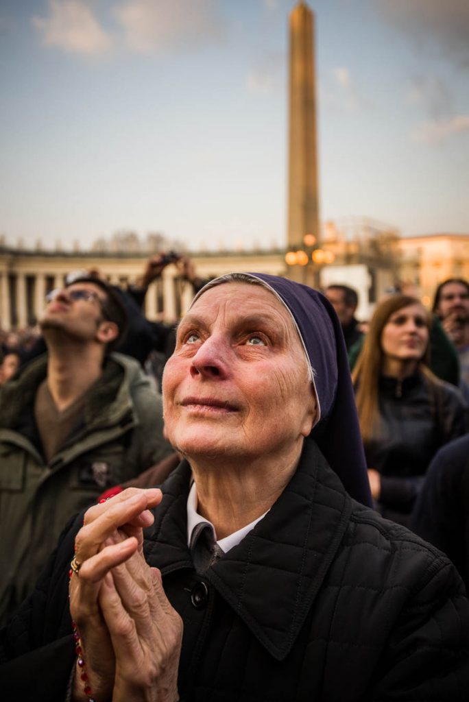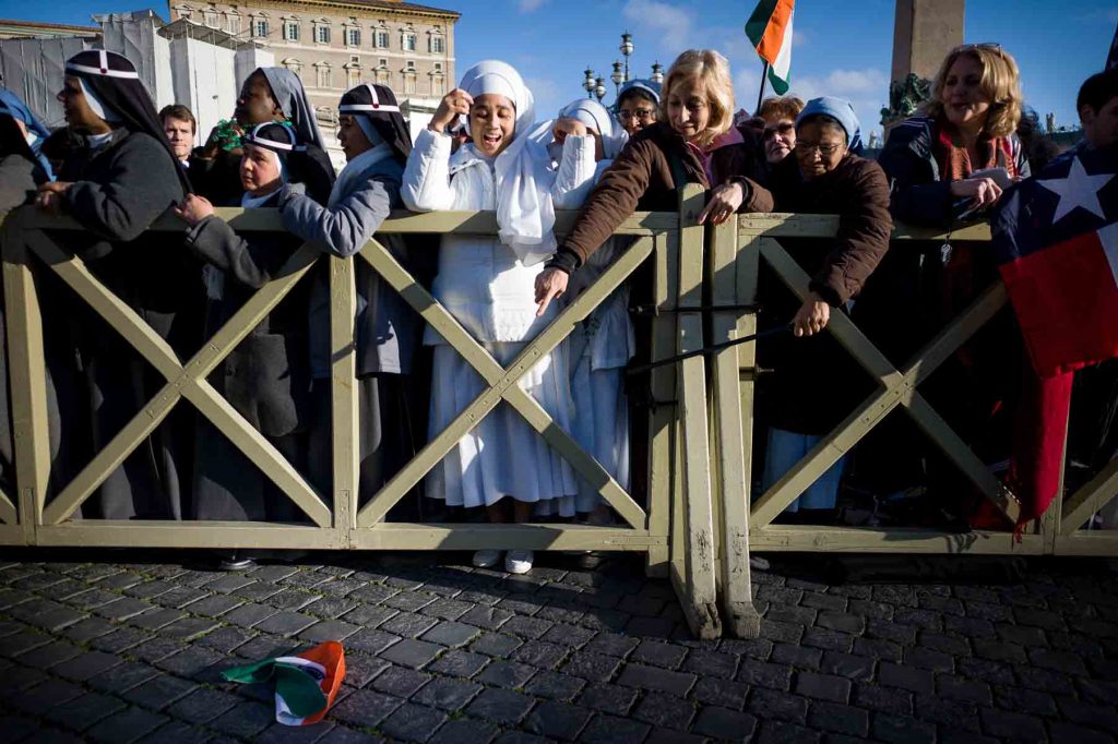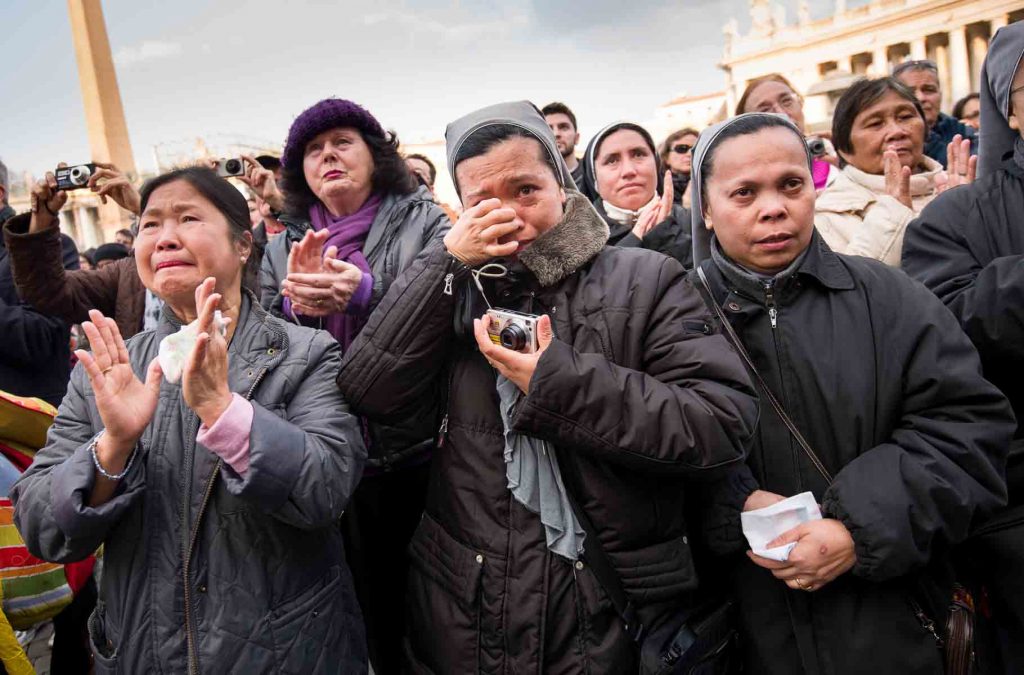 Vatican City, Rome, Italy; 28 feb 2013, People in S.Peter´s squeare sayng goodbye to Pope Benedict XVI. He left the Vatican by helicopter on Thursday afternoon to spend the final hours of his nearly eight-year, scandal-dogged papacy at the papal summer residence. Onlookers in St. Peter’s Square cheered, church bells rang and Romans stood on rooftops to wave flags as he flew from Rome to Castel Gandolfo, a hilltop town southeast of the city where popes have summered for centuries.
