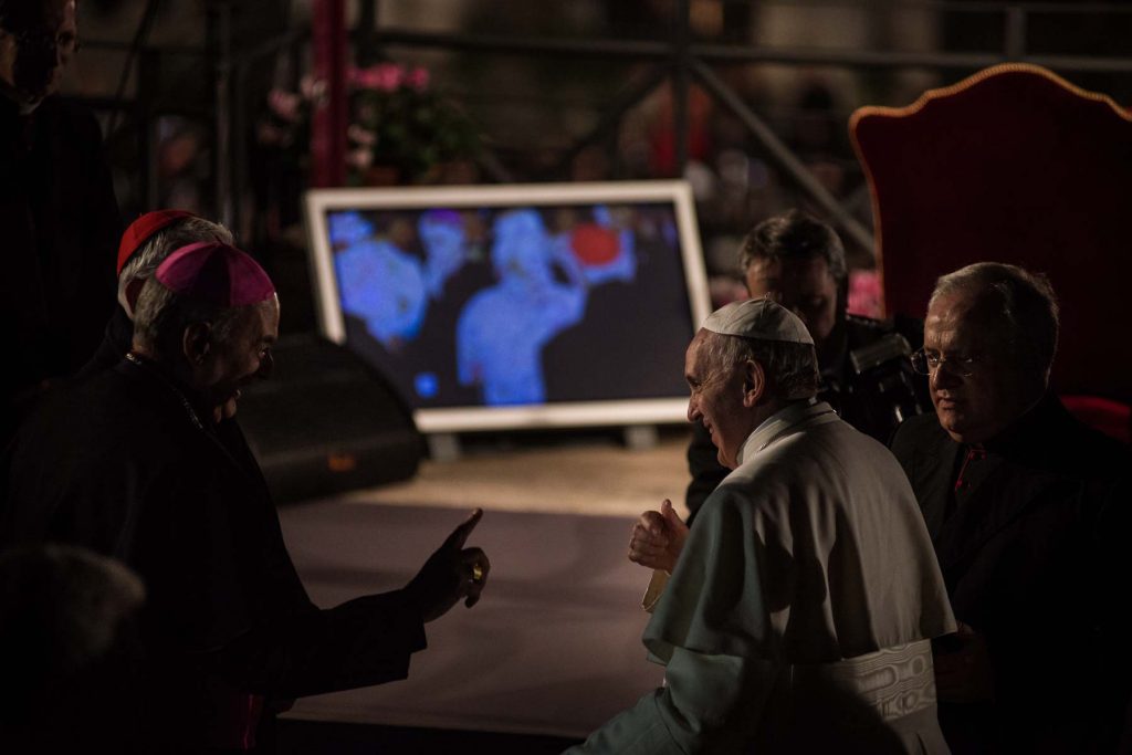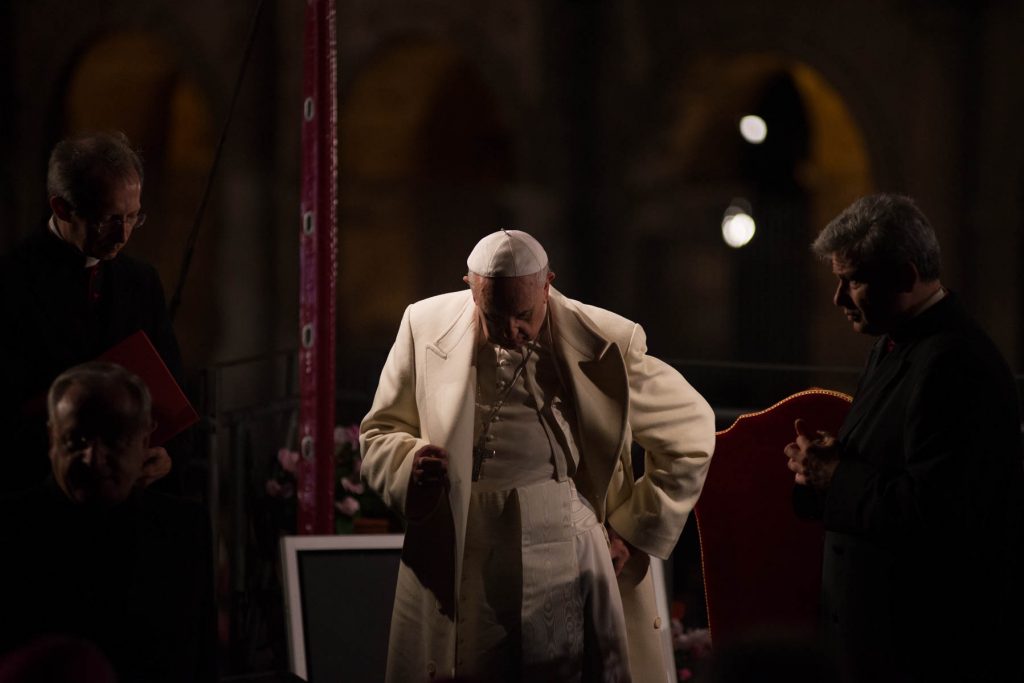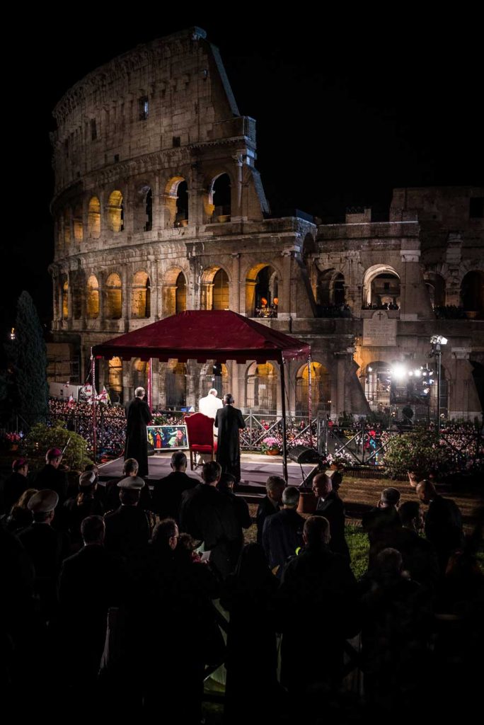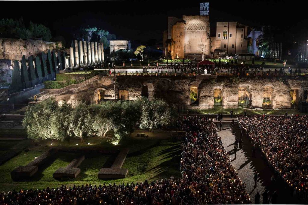 Rome, Italy, April 14 2017.About 20,000 faithful were present tonight, at the traditional Via Crucis (Way of the Cross) presided over by Pope Francis near the Colosseum in Rome. With much security amidst a climate of meditation and prayer, thousands of small flames of the candles that illuminated the night.