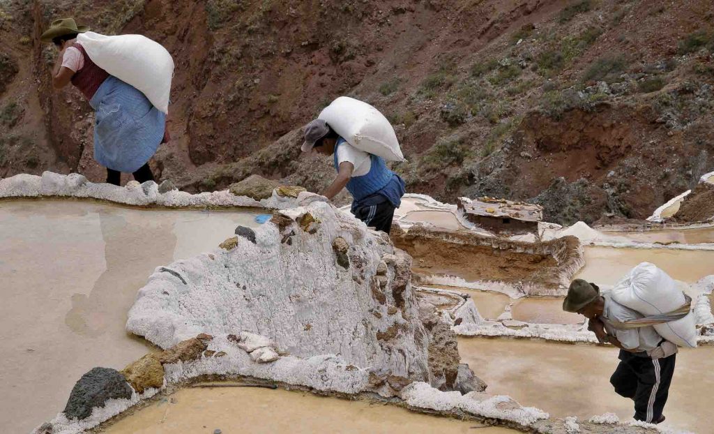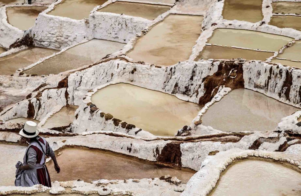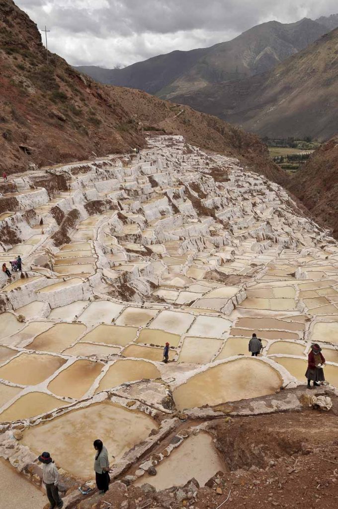 Peru,The Salinas in the Cuzco region. People extracting the salt from the water