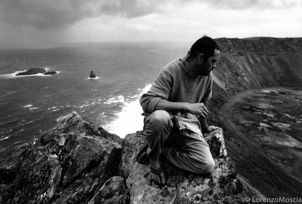 En la escena final de este encuentro en Rapa Nui, el nuevo rey camina por los alrededores del Volcán Orongo con su corona de plumas y mahute. La tarde cae allá al fondo.