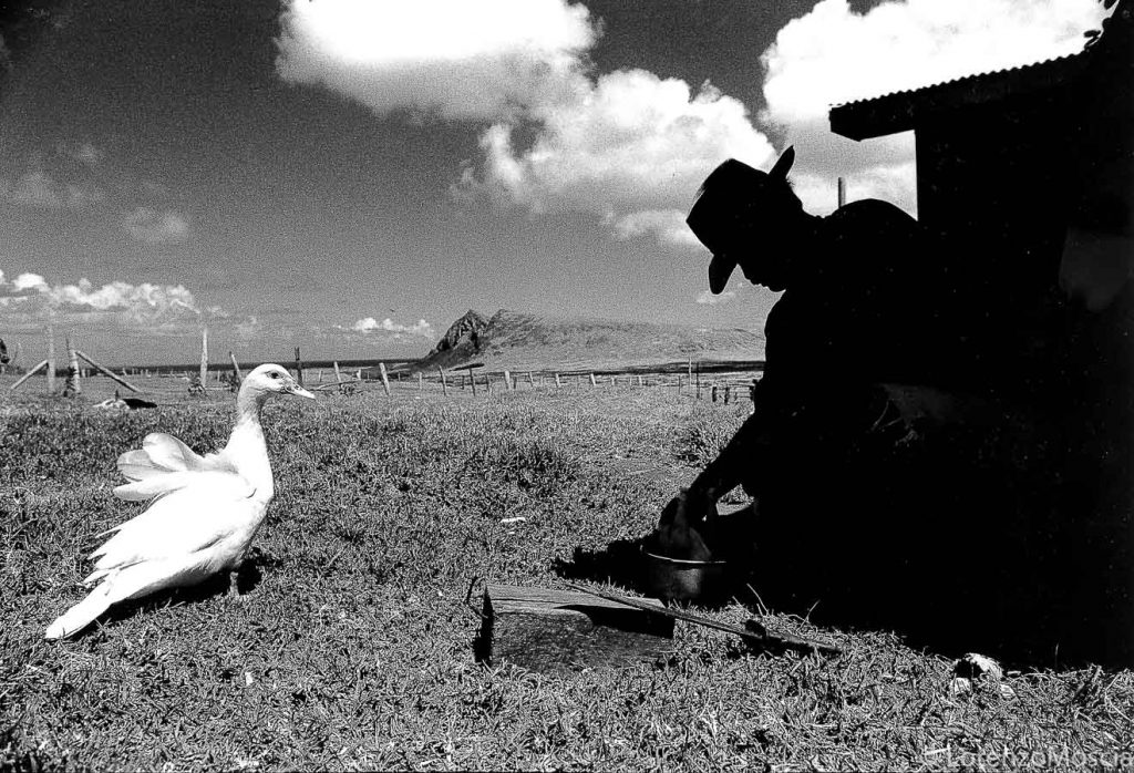Cuando posa para la foto, marcial e imperturbable, con una guayabera roja, me dice que el Estado Chileno libró a la isla de la lepra, que en un momento todos estaban infectados y que no hay que descuidarse porque hace 15 años volvió a aparecer un caso. “¿Cómo yo voy a morder la mano que me ha ayudado?”.
