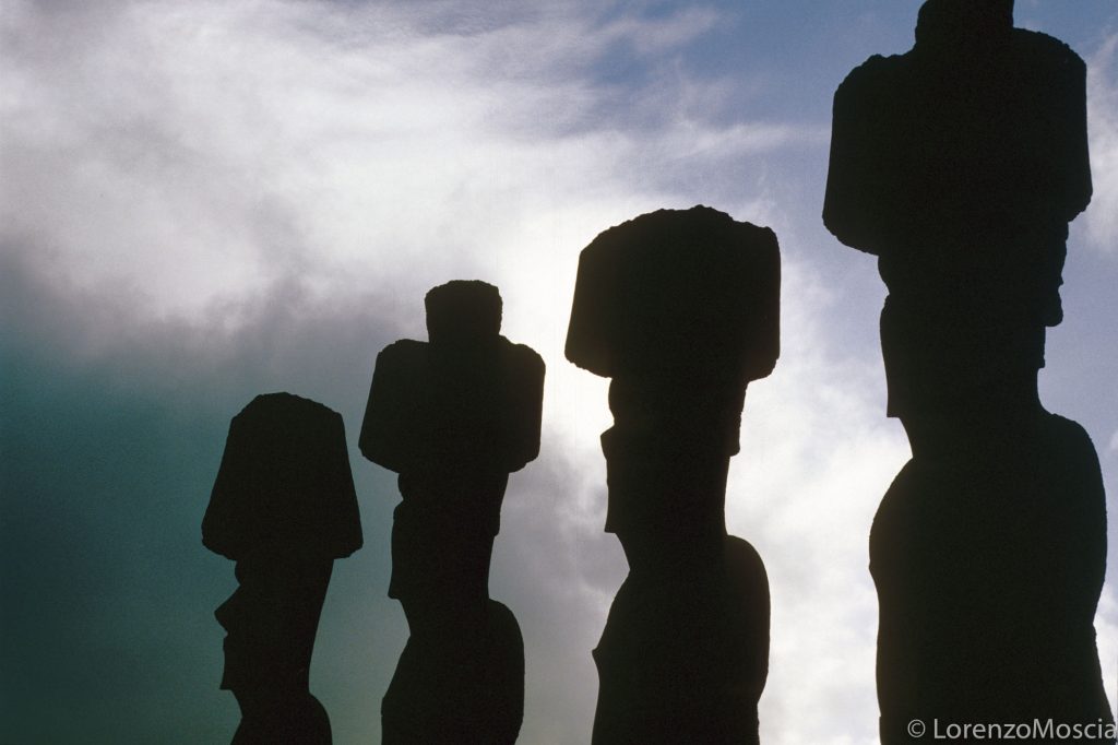 Después de una hora y media, la reunión termina. Partimos en el jeep rumbo a las cabañas que arrendamos. Un carabinero nos pide los documentos. Es de Angol, lleva tres meses y se acostumbra a la isla. La imagen de un carabinero aquí es extraña. Nos detenemos unos minutos a tomar fotos en los moais del Tahai. El AhuTahai y el AhuKo Te Rikuse recortan contra un cielo nunca visto en Santiago.