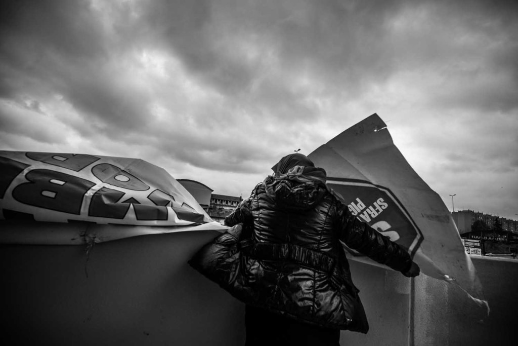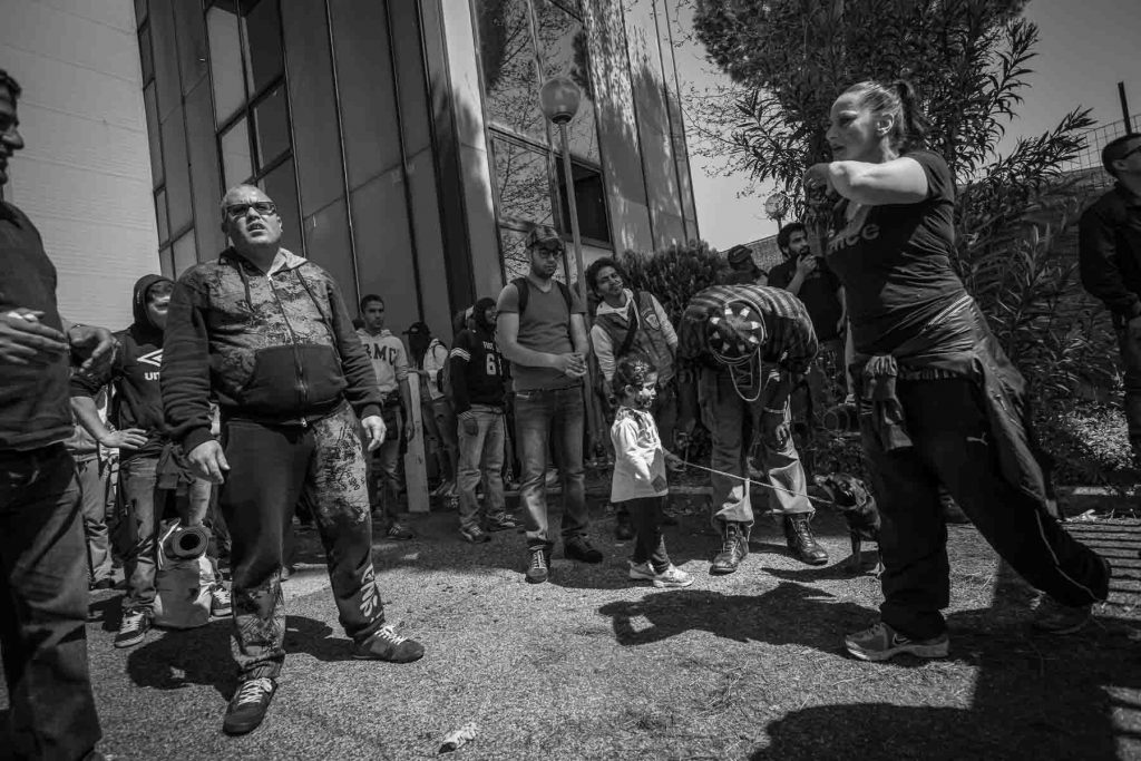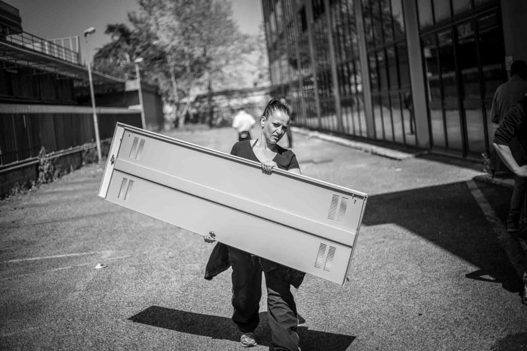 Rome, Italy, apr,2014.A woman is carring a metal door in order to block the entrance of the building they just have occupied. A group of homeless from both Italian and non-EU countries occupy an abandoned building that up to nine months ago belong to the offices of the National Social Security Institute (INPS).Un gruppo di senza casa sia italiani che provenienti da paesi extracomunitari occupano un edificio abbandonato che fino a 9 mesi fa era la sede di uffici dell Istituto Nazionale della Previdenza Sociale (INPS).