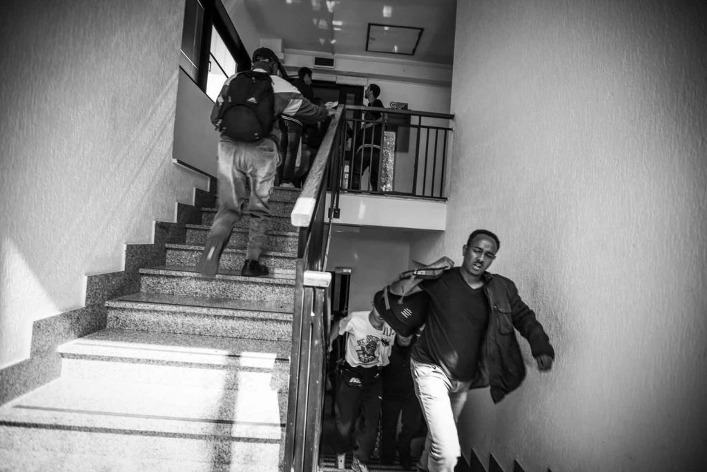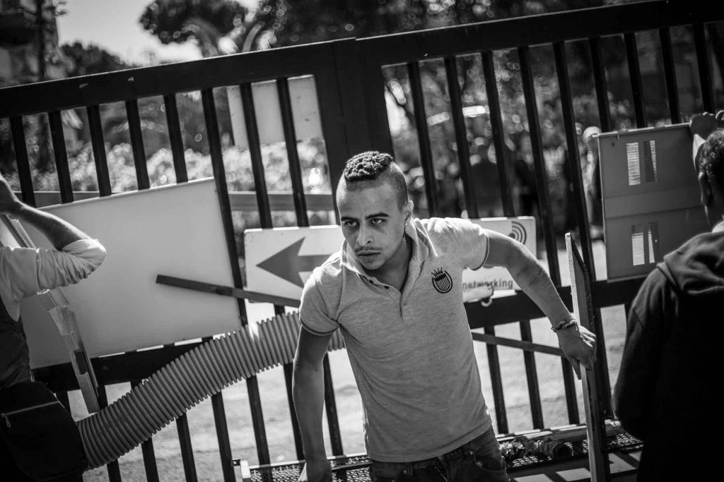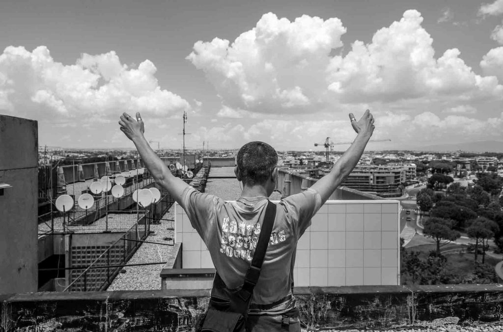 Rome, Italy, apr,2014. People reaching the roof of an empty building. A group of homeless from both Italian and non-EU countries occupy an abandoned building that up to nine months ago belong to the offices of the National Social Security Institute (INPS).