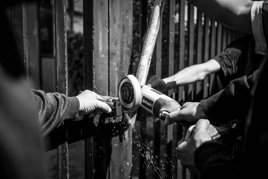 Rome, Italy, apr,2014.A group of homeless breaks the chains that are blocking the entrance to an abandoned building. A group of homeless from both Italian and non-EU countries occupy an abandoned building that up to nine months ago belong to the offices of the National Social Security Institute (INPS).Un gruppo di senza casa sia italiani che provenienti da paesi extracomunitari occupano un edificio abbandonato che fino a 9 mesi fa era la sede di uffici dell Istituto Nazionale della Previdenza Sociale (INPS).