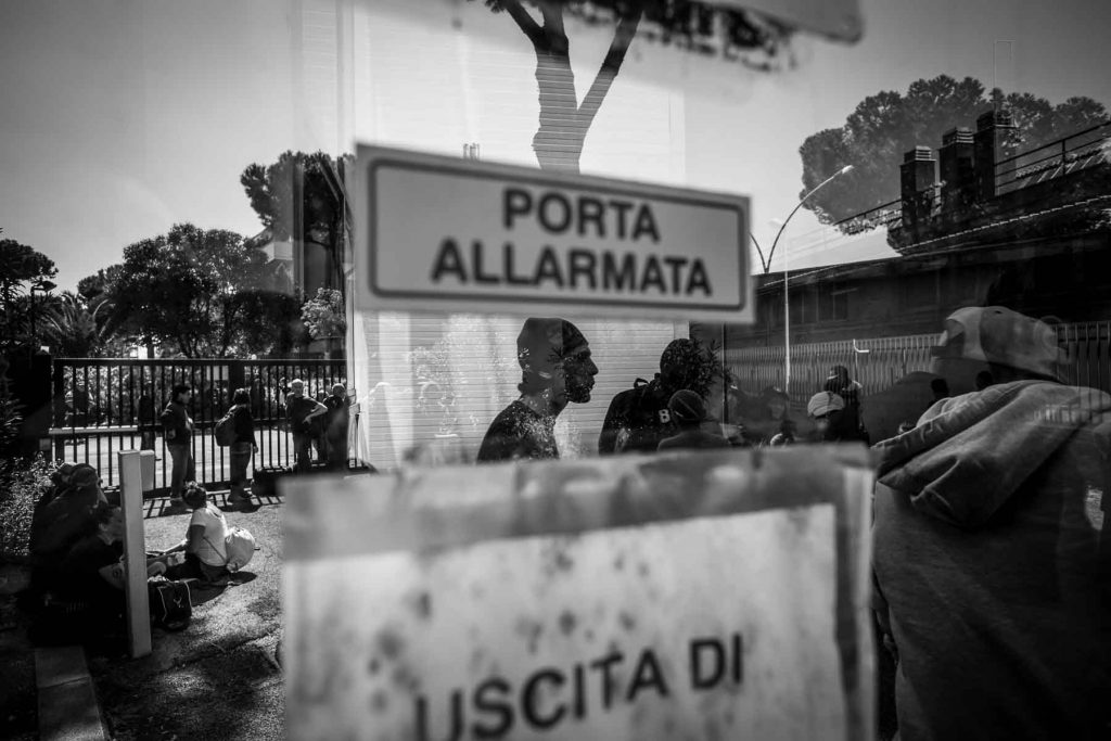 Rome, Italy, apr,2014.A security guard is trayng to convince the homeless to leave the building.