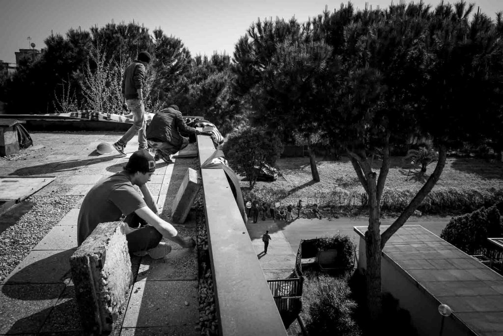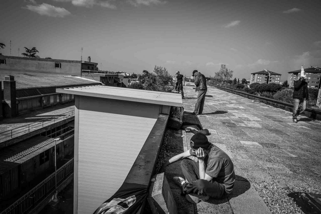 Rome, Italy, apr,2014.Peole on the roof of a building that has been just occpied. A group of homeless from both Italian and non-EU countries occupy an abandoned building that up to nine months ago belong to the offices of the National Social Security Institute (INPS).Un gruppo di senza casa sia italiani che provenienti da paesi extracomunitari occupano un edificio abbandonato che fino a 9 mesi fa era la sede di uffici dell Istituto Nazionale della Previdenza Sociale (INPS). A group of homeless from both Italian and non-EU countries occupy an abandoned building that up to nine months ago belong to the offices of the National Social Security Institute (INPS).Un gruppo di senza casa sia italiani che provenienti da paesi extracomunitari occupano un edificio abbandonato che fino a 9 mesi fa era la sede di uffici dell Istituto Nazionale della Previdenza Sociale (INPS). A group of homeless from both Italian and non-EU countries occupy an abandoned building that up to nine months ago belong to the offices of the National Social Security Institute (INPS).Un gruppo di senza casa sia italiani che provenienti da paesi extracomunitari occupano un edificio abbandonato che fino a 9 mesi fa era la sede di uffici dell Istituto Nazionale della Previdenza Sociale (INPS).