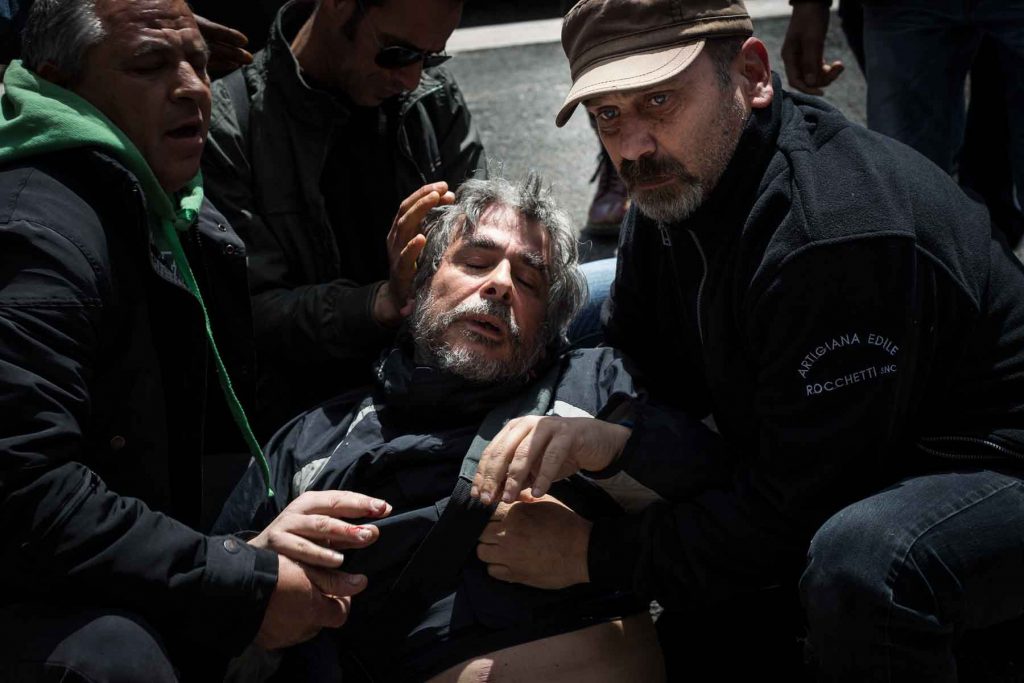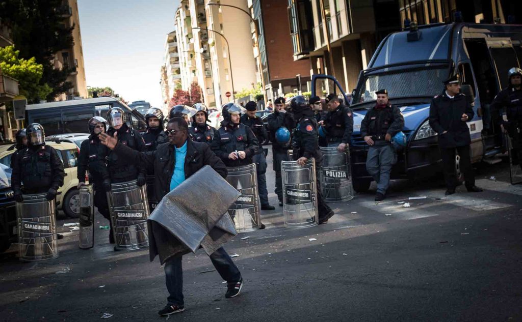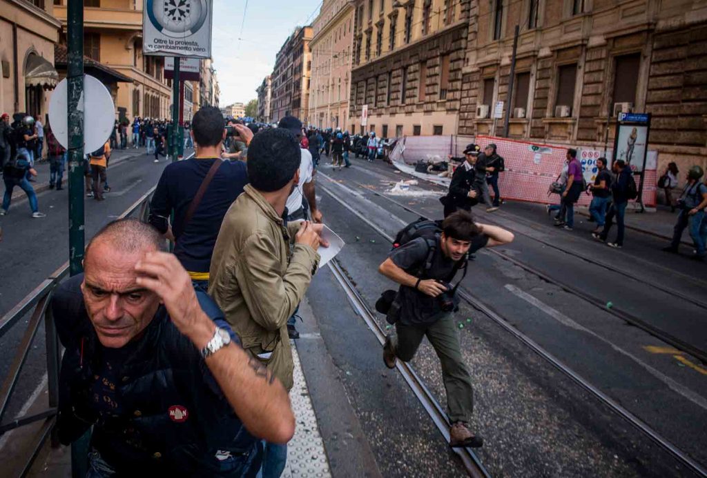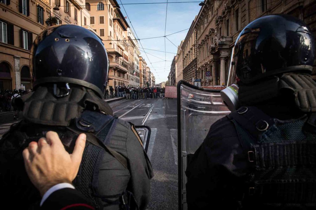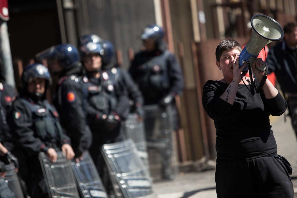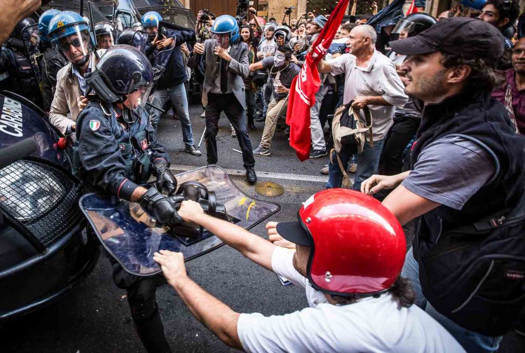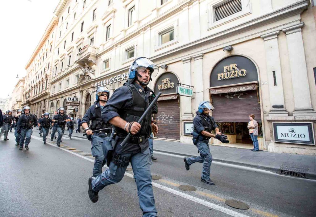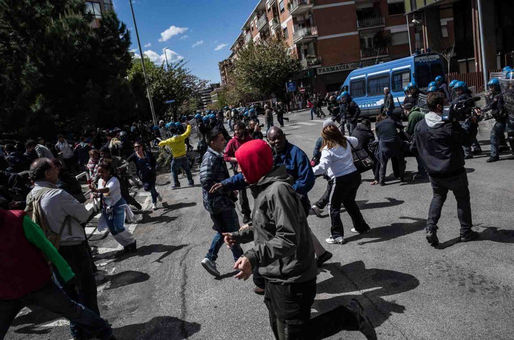 Rome, Italy, 16/4/2014.Several people have been injured in Rome as clashes erupted while Italian police evicted 350 squatter families caught up in the country’s economic crisis. 350 families are locked on the roof of an occupied building.Riot police get ready to drag away some 350 squatter families from abandoned offices in Rome