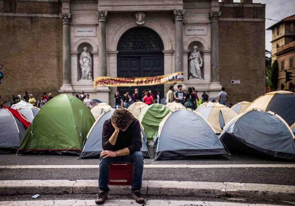 Rome, Italy, may 2014. Protesters camping in front of the Italian Parliament. At the base of the protest the rule that it is not possible to connect electricity and gas for those illegally occupying a house.