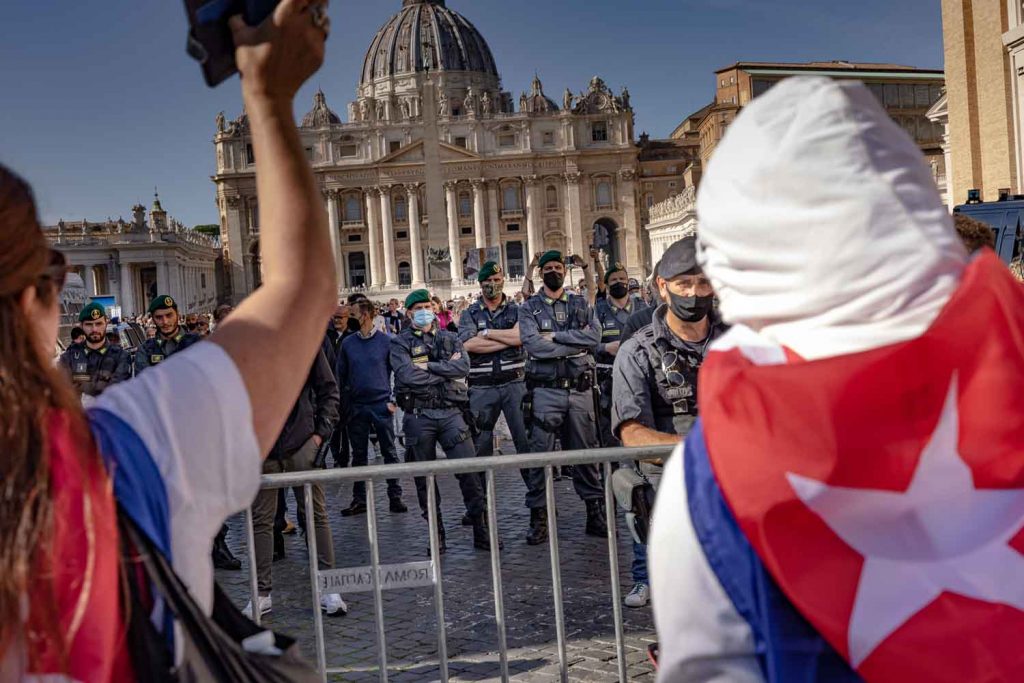 Rome, 24 october 2021Several hundred Cubans who were not allowed to enter St. Peter’s Square to attend the usual speech of Pope Francis (Angelus) protested lying on the ground. The peaceful protest aimed to bring to the attention of the Holy Father the lack of freedom and the constant trampling of civil rights on the island of Cuba. Free elections, multi-partyism, freedom and respect for civil rights are the requests that despite the massive presence of Cubans in Rome Pope Francis seems to want to continue to ignore by openly siding in favor of a dictatorship against the principle of respect for the human condition